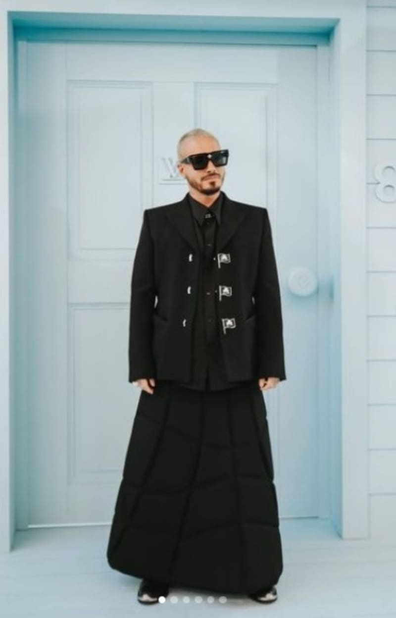 En este 2022 el cantante colombiano sorprendió al llegar al desfile de Louis Vuitton en París con un atuendo completamente oscuro. Su look incluía una camisa, chaqueta, al igual que botas y lentes en negro. Llamando indudablemente la atención su falda maxi acolchada.