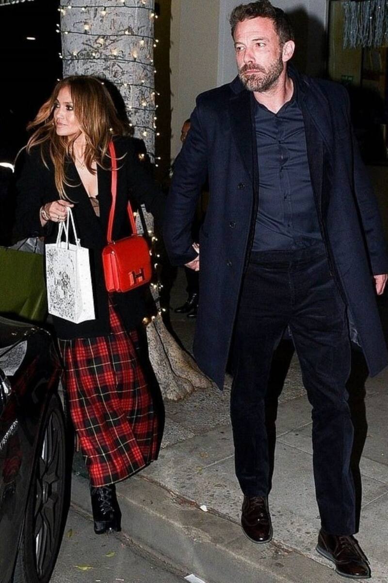 La Reina del Bronx llamaba la atención por una blusa transparente negra que no pasaba inadvertida, junto con una falda larga a cuadrillé rojo. Affleck, de 49 años, vestía pantalones aterciopelados negros, una gabardina y camisa de seda en el tono y zapatos de charol.