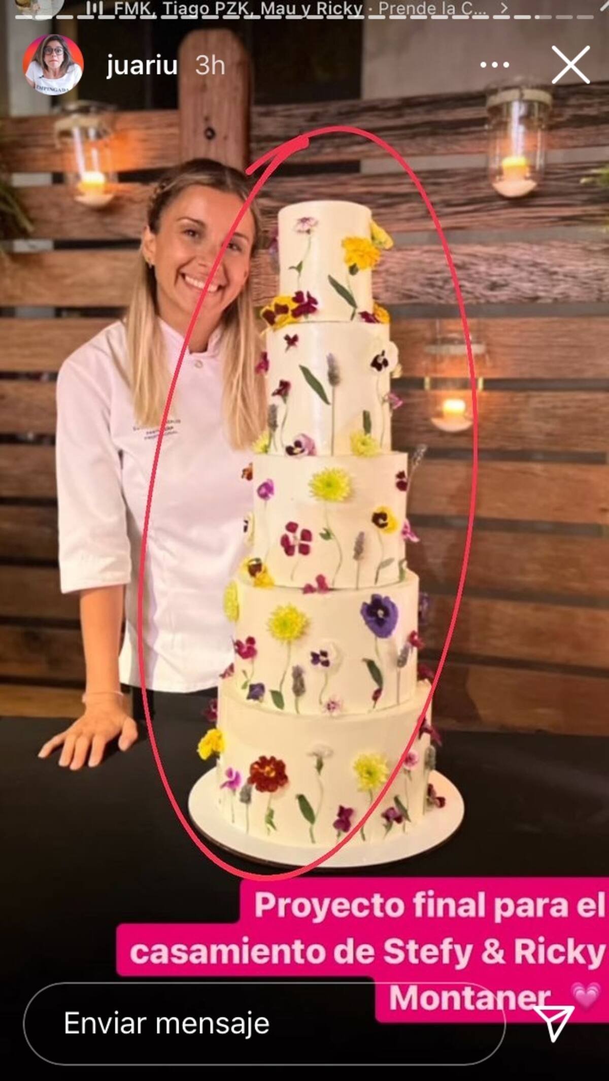 Aunado a esto, las fotografías sobre el pastel de bodas no se hicieron esperar, incluso filtraron imágenes de la pastelera que lo realizó. La torta fue hecha de cinco pisos, el fondo era blanco y tenía decoraciones de flores, las cuales eran de todos los colores.