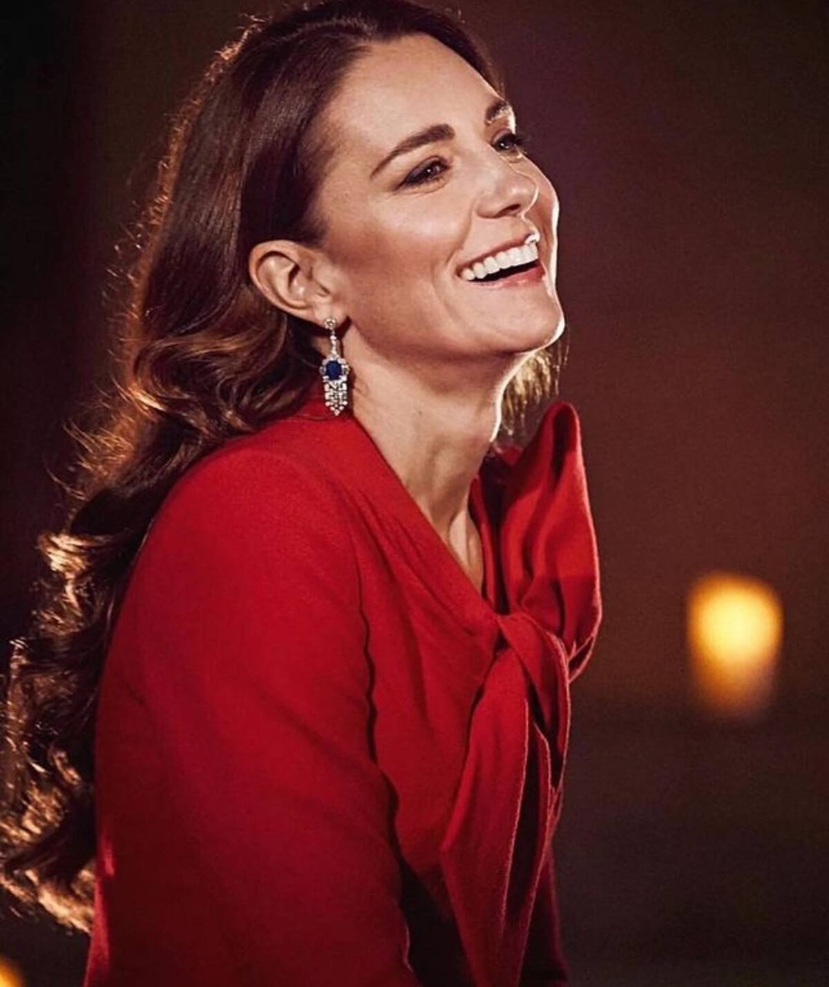 El fotógrafo Paolo Roversi fue el encargado de retratar a Middleton quien portó tres lujosos vestidos Alexander McQueen los cuales sufrieron algunas modificaciones para que la duquesa pudiera usarlos. El primero es un vestido totalmente rojo, que originalmente tenía detalles en blanco, la característica de esta prenda es la manga abullonada.