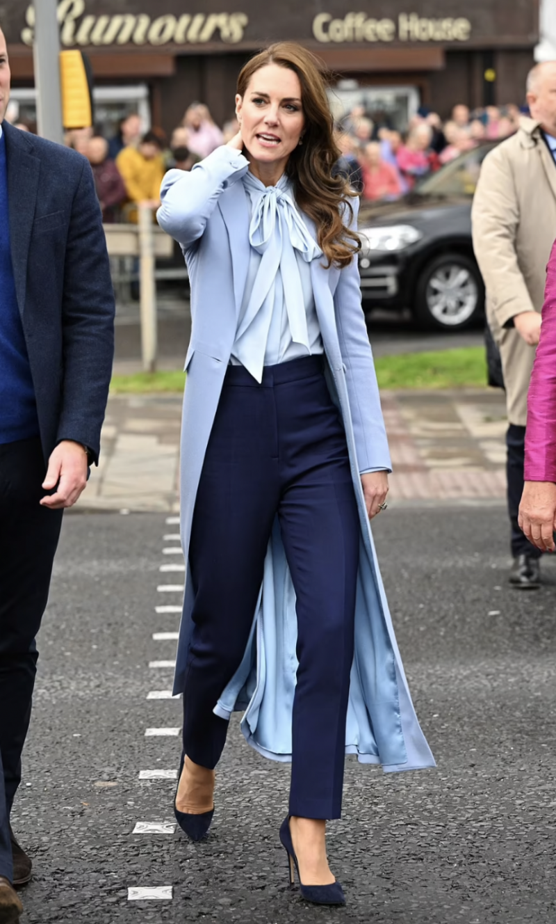 A Kate le gusta variar sus looks casuales para los eventos reales, en sus más recientes apariciones ha optado por usar esa combinación de colores, ya que en su primera aparición en Gales como príncipes, también uso un saco azul cielo que combinó con pantalones azul marino, aunque días antes apostó por un vestido largo en amarillo mostaza.