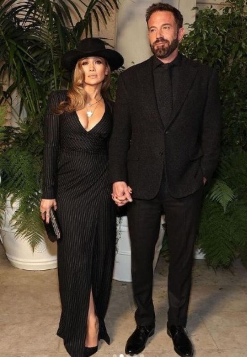 Jennifer López complementó su atuendo con un par de tacones negros de Christian Louboutin, que hizo acortar la diferencia de estatura que tiene con su esposo, y un sombrero de vaquero también de tono oscuro.