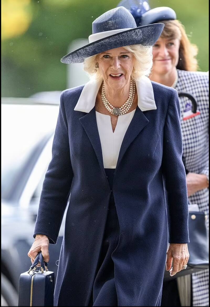 Para la ocasión, la reina consorte llegó muy sonriente al Día de los Campeones Británicos de QIPCO y eligió un vestido y un abrigo azul marino con detalles en blanco de Bruce Oldfield, el cual combinó con un sombrero en los mismos colores de Philip Treacy, completó su look con medias y zapatos de gamuza en negro, además de un collar de cuatro hilos de pelas.