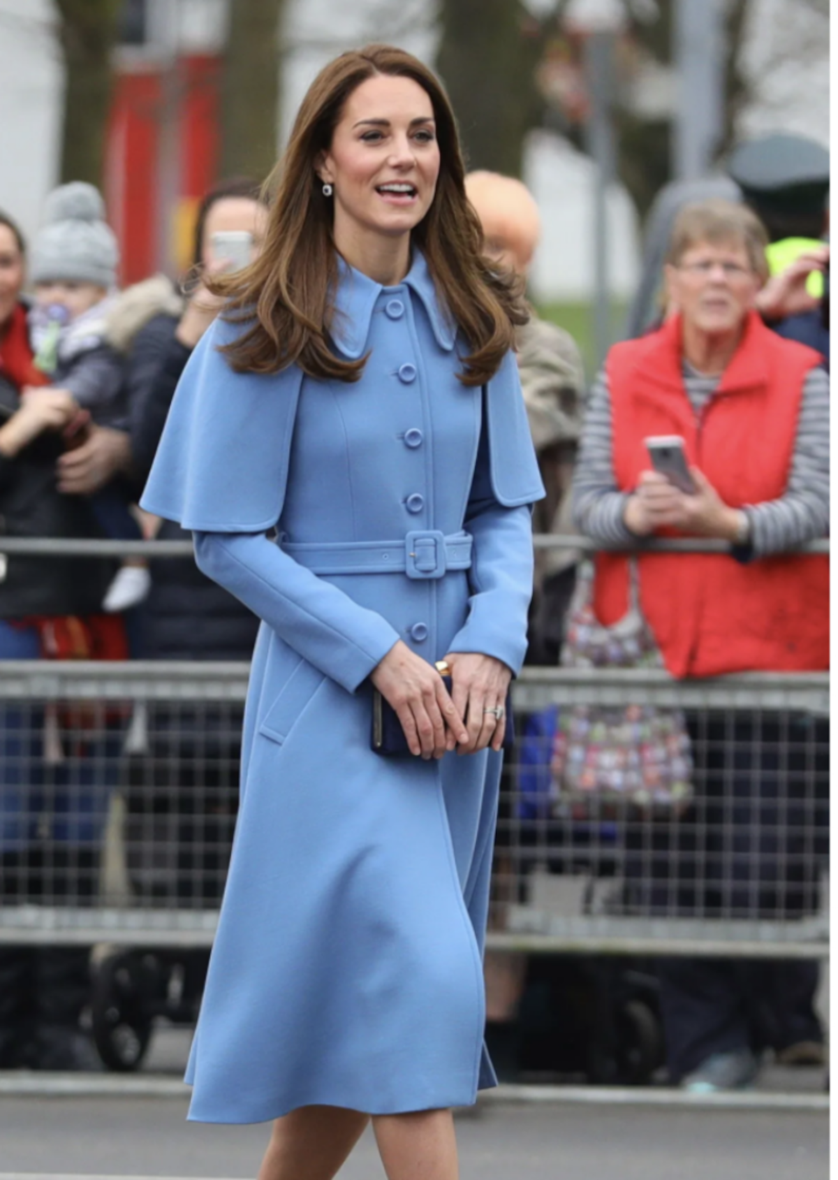 Mediante redes sociales, los seguidores de la esposa del príncipe William (40) compararon el outfit que usó en 2019 con el icónico uniforme de la Academia Beauxbatons de Harry Potter. Se trata de un abrigo azul celeste de la firma inglesa Mulberry con una especie de capa y cinturón, con el que encantó.
