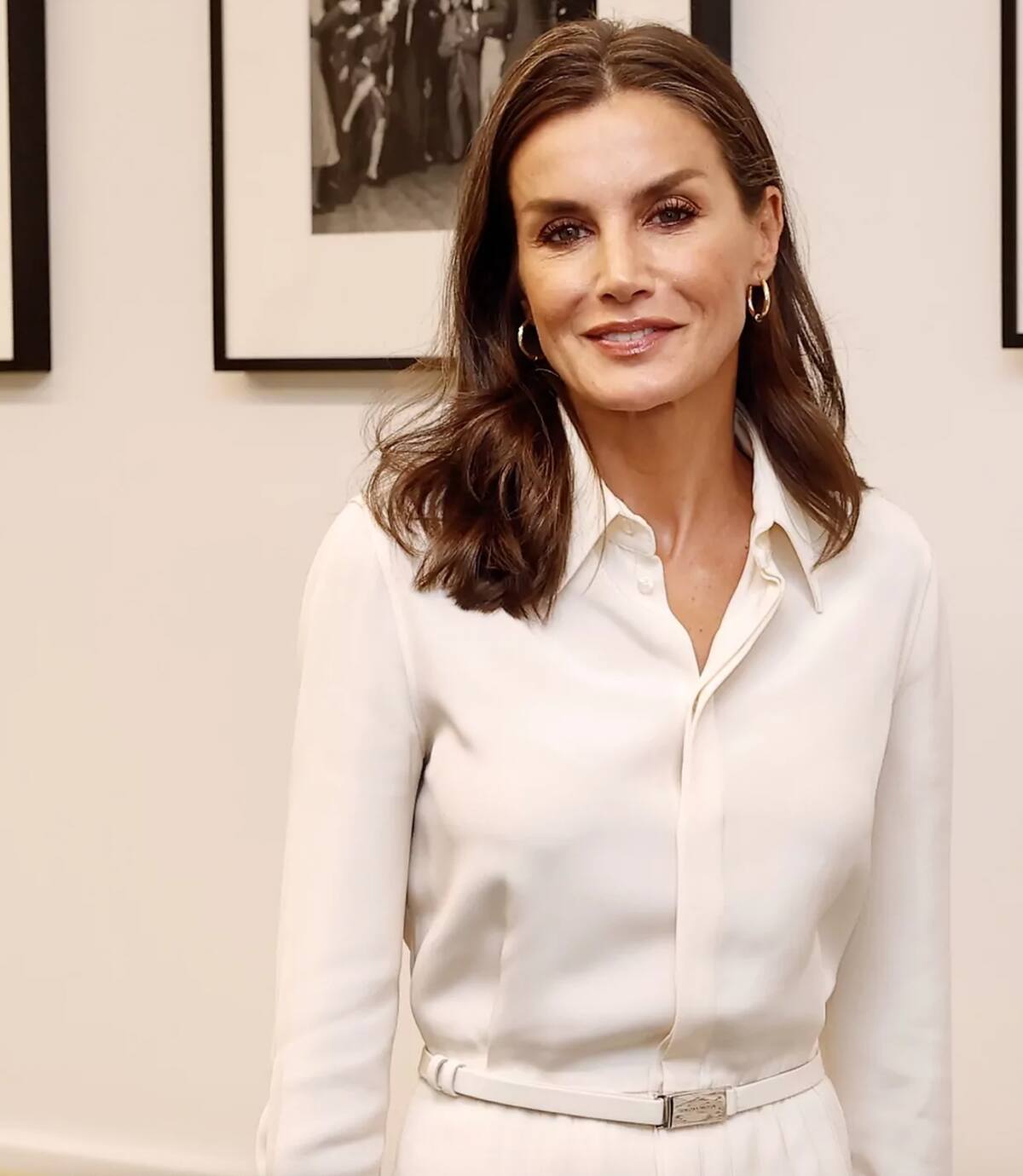 La reina consorte española decidió rescatar desde su armario un conjunto de dos piezas de la marca Hugo Boss que ya había utilizado en 2020. El traje estaba compuesto por un saco entallado y un pantalón recto, ambas piezas de raya y en azul marino, fueron combinadas un playera blanco debajo.