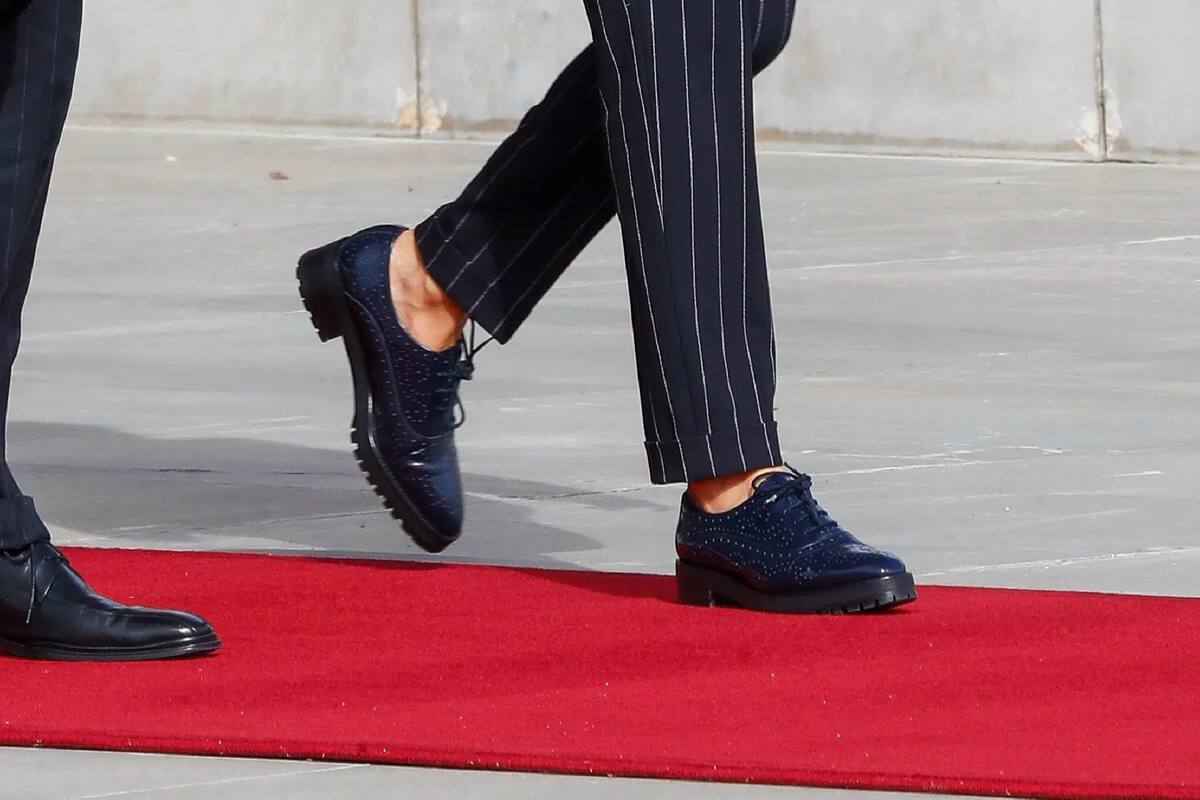 En el inicio del viaje de los reyes españoles a Alemania, llamó la atención el calzado que Letizia escogió para la ocasión. Esta vez, la reina decidió prescindir de los tacones y optó por unos zapatos blucher. El calzado de marca española Uterque, del mismo color que el traje, tenía una pequeña plataforma dentada.