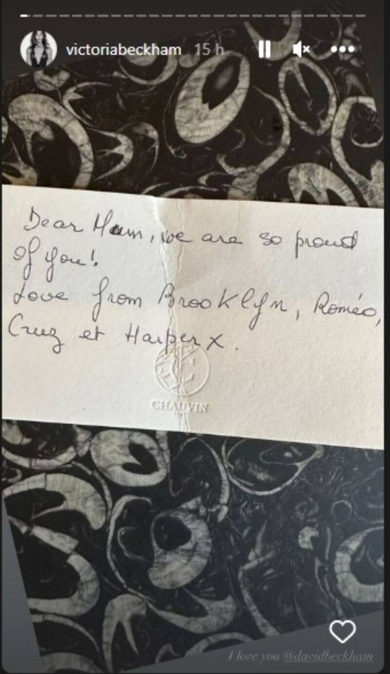 "Querida mamá, ¡estamos muy orgullosos de ti! Con amor de Brooklyn, Romeo, Cruz y Harper x”, decía el mensaje del significativo detalle de las flores de Chauvin. Además Victoria escribió: "Te amo @davidbeckham", en agradecimiento a su esposo.