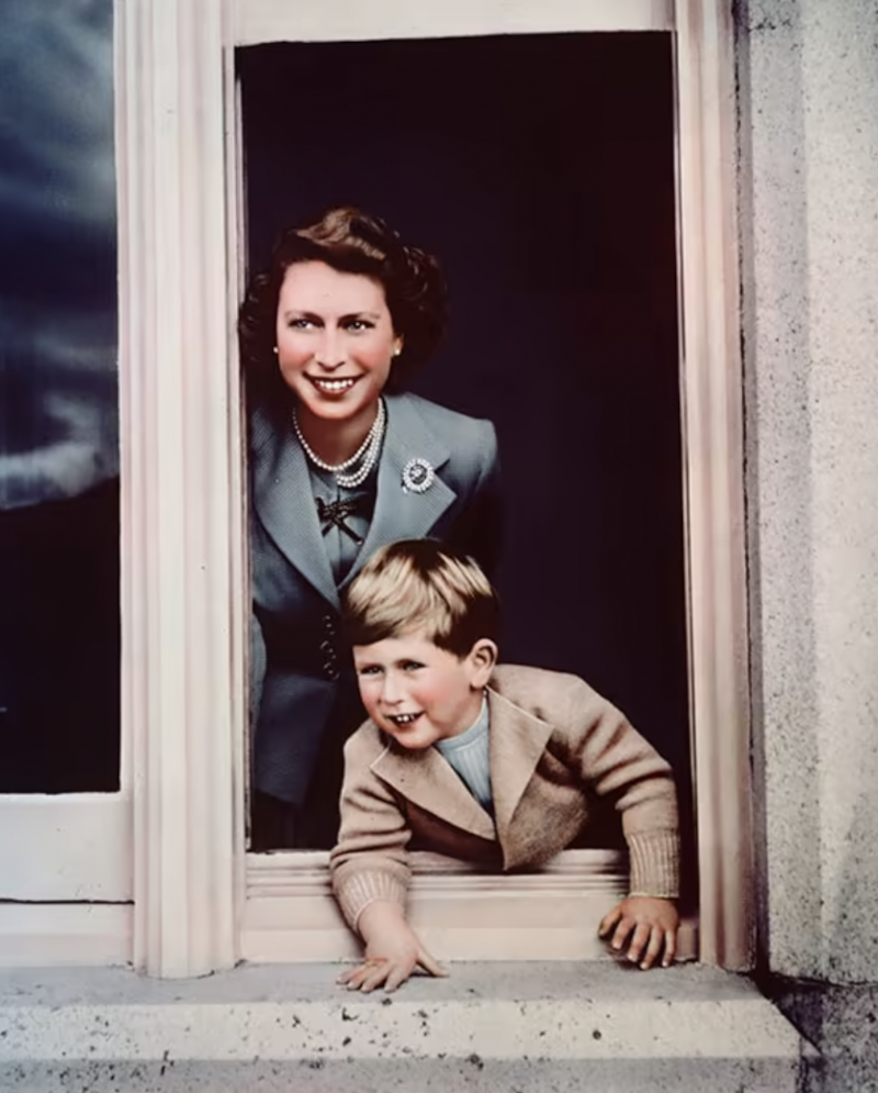 En la tarjeta se ve el nuevo símbolo del rey en la portada, mientras que en el interior presenta una hermosa foto de Carlos III, cuando tenía 4 años, al lado de su madre, quien en ese entonces aún era la princesa Isabel, mirando por una ventana a Balmoral, la residencia real favorita de la difunta Reina y en donde falleció a los 96 años.