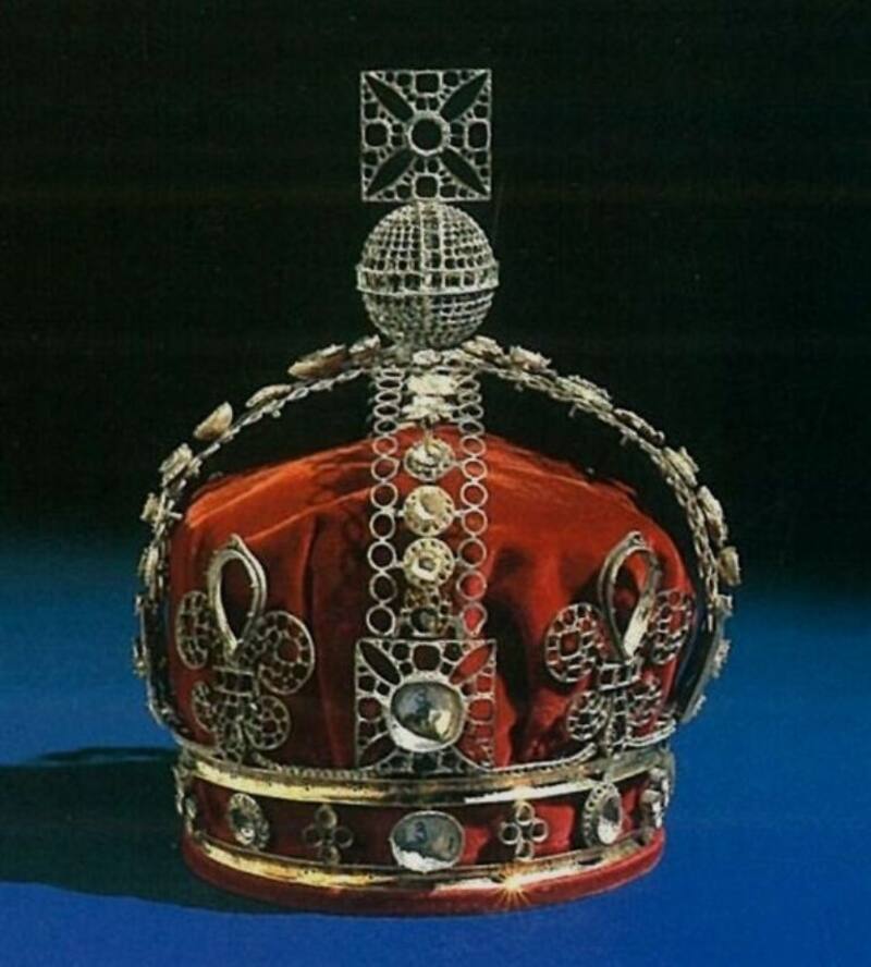 La corona creada para Jorge IV en 1821 era una de los tocados favoritos de la difunta reina Isabel II. La diadema estatal está engastada con mil 333 diamantes en plata y oro, posee un diamante amarillo de cuatro quilates en el frente y su diseño permite incorporar los emblemas nacionales de cardo, trébol y rosa.