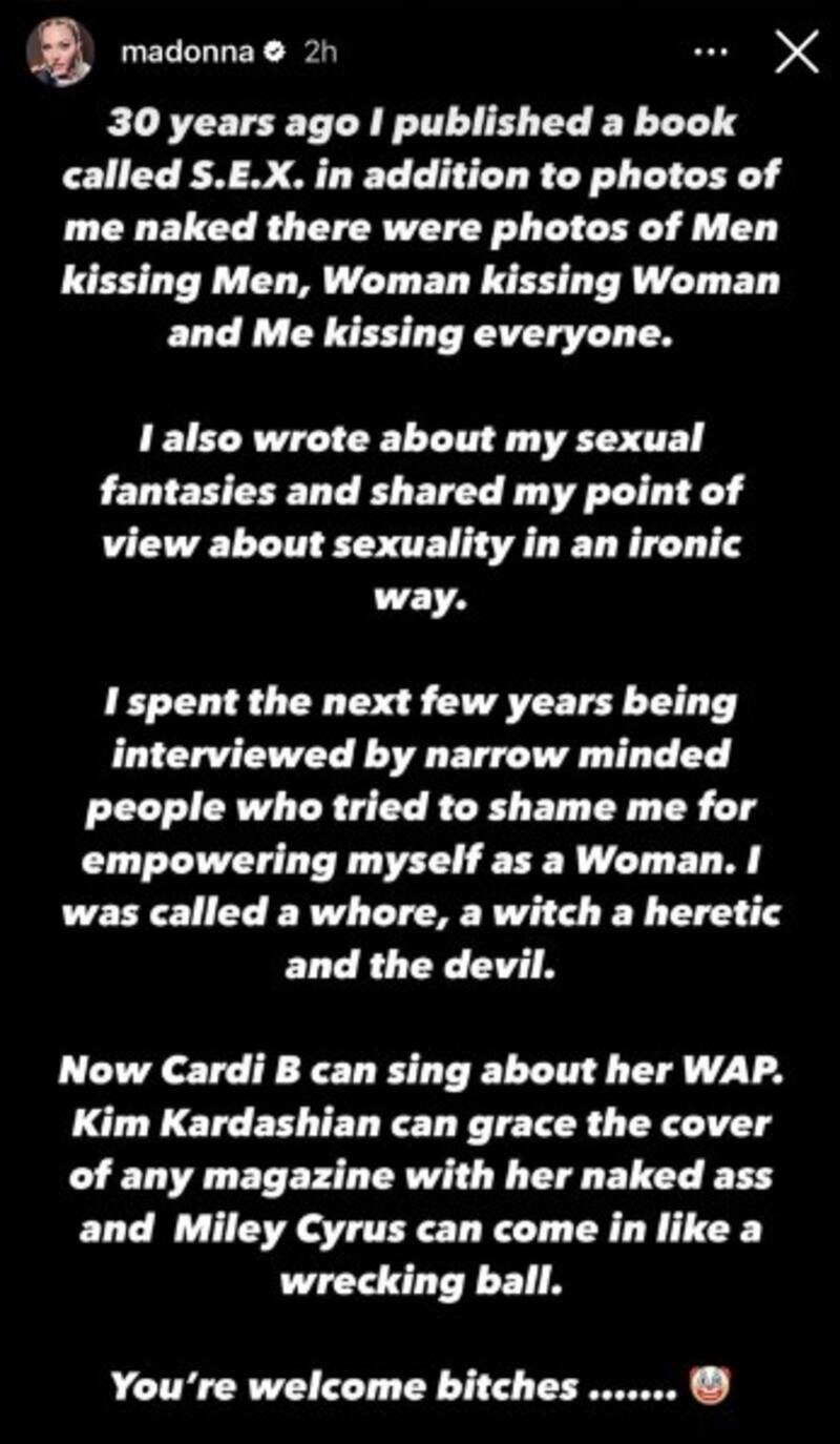 "Ahora Cardi B puede cantar sobre su WAP. Kim Kardashian puede aparecer en la portada de cualquier revista con su trasero desnudo y Miley Cyrus puede aparecer como una bola de demolición", escribió Madonna, que añadió lo que le dolió a Cardi B: "De nada, perras".