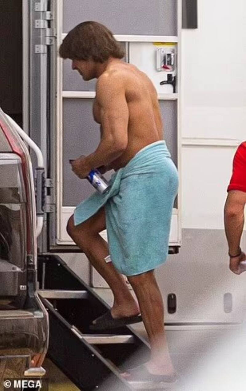 Si bien, en sus últimas interpretaciones, Zac Efron ya lucía un cuerpo muy tonificado, en esta oportunidad el actor fue fotografiado paseando por el set de la producción en toalla, mostrando su musculoso físico, además de un gran bronceado acompañado de un corte de pelo muy distinto al que suele ocupar.