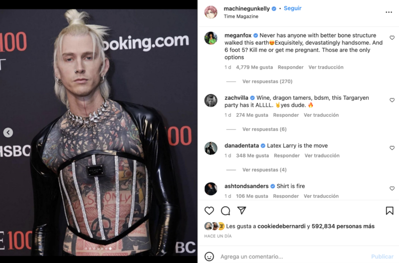 MGK subió a su cuenta de Instagram varias fotos en donde luce un look con pantalones de látex negro, un corsé transparente y mangas negras con guantes y por su rubia cabellera, el músico hizo una referencia a la serie House of the Dragon: "Vine para la fiesta Targaryen BDSM".