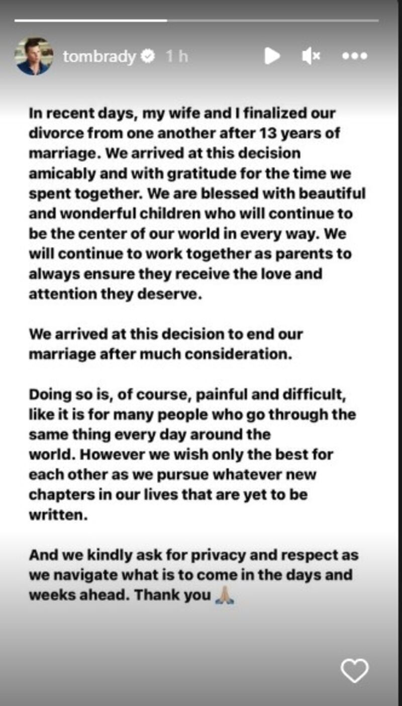 "Mi esposa y yo hemos finalizado nuestro divorcio después de 13 años de matrimonio. Llegamos a esta decisión amistosamente y con gratitud por el tiempo que pasamos juntos. Hemos sidos bendecidos con hermosos y maravillosos hijos que seguirán siendo el centro de nuestro mundo en todos los sentidos", escribió Brady en sus redes.