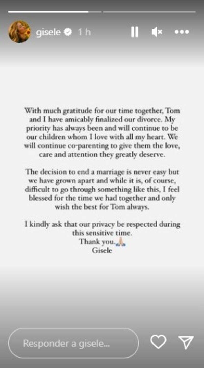 Por su parte, Gisele escribió: "Con mucha gratitud por nuestro tiempo juntos, Tom y yo hemos decidido finalizar amistosamente nuestro divorcio. Mi prioridad siempre han sido y seguirán siendo mis hijos a los que amo con todo mi corazón. Nosotros continuaremos con la crianza conjunta para darles el cuidado y atención que tanto merecen.
