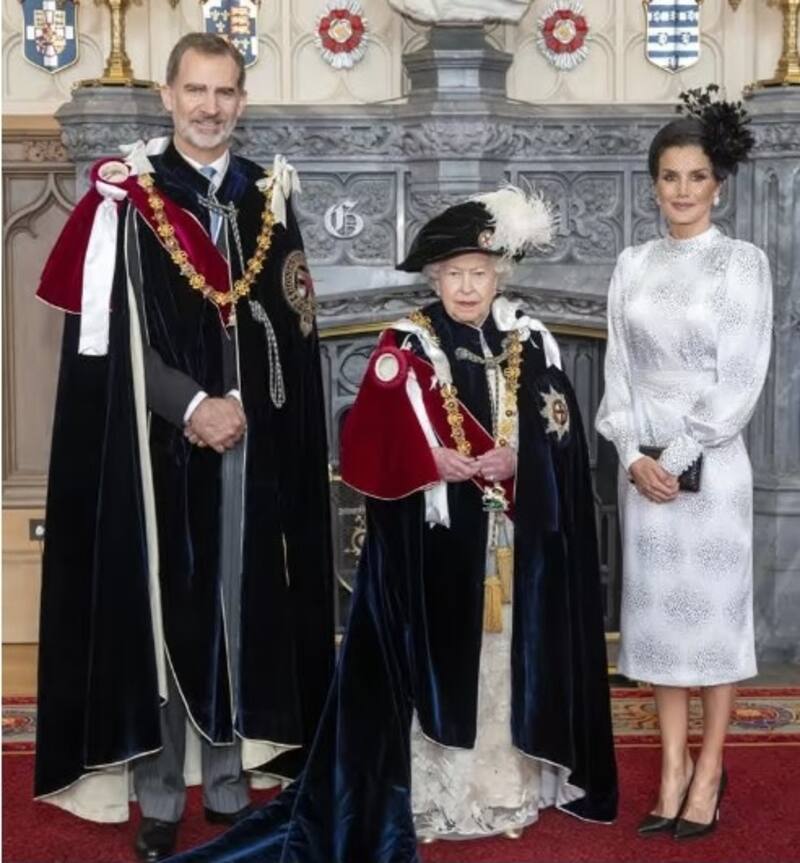 La reina española acompañó al rey Felipe en la Ceremonia de investidura como caballero de la Orden de la Jarretera y aunque portó el mismo vestido, optó por conjugar su outfit con unos zapatos Prada y un bolso de Jimmy Choo, y una diadema amplia a modo de tocado con redecilla a juego y plumas de oca en el lateral.