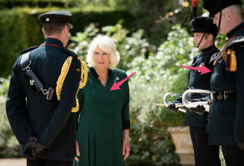 En la ceremonia, la ahora reina consorte asumió el papel de Coronel en Jefe de The Rifles del Príncipe Felipe y de acuerdo con la revista Hola! el abrigo verde de Camilla con adornos negros fue diseñado para combinar con los uniformes verdes del regimiento con botones negros.