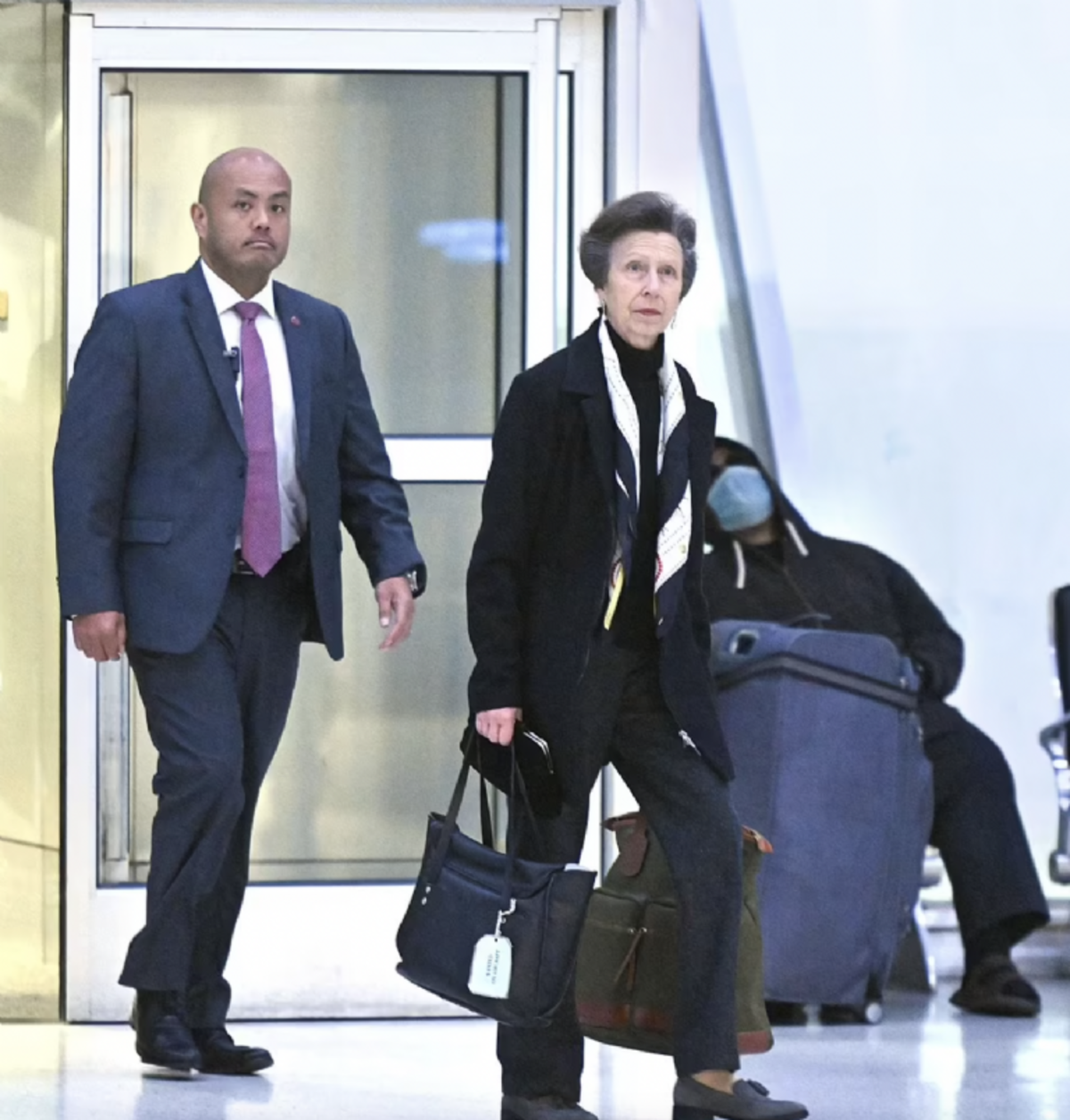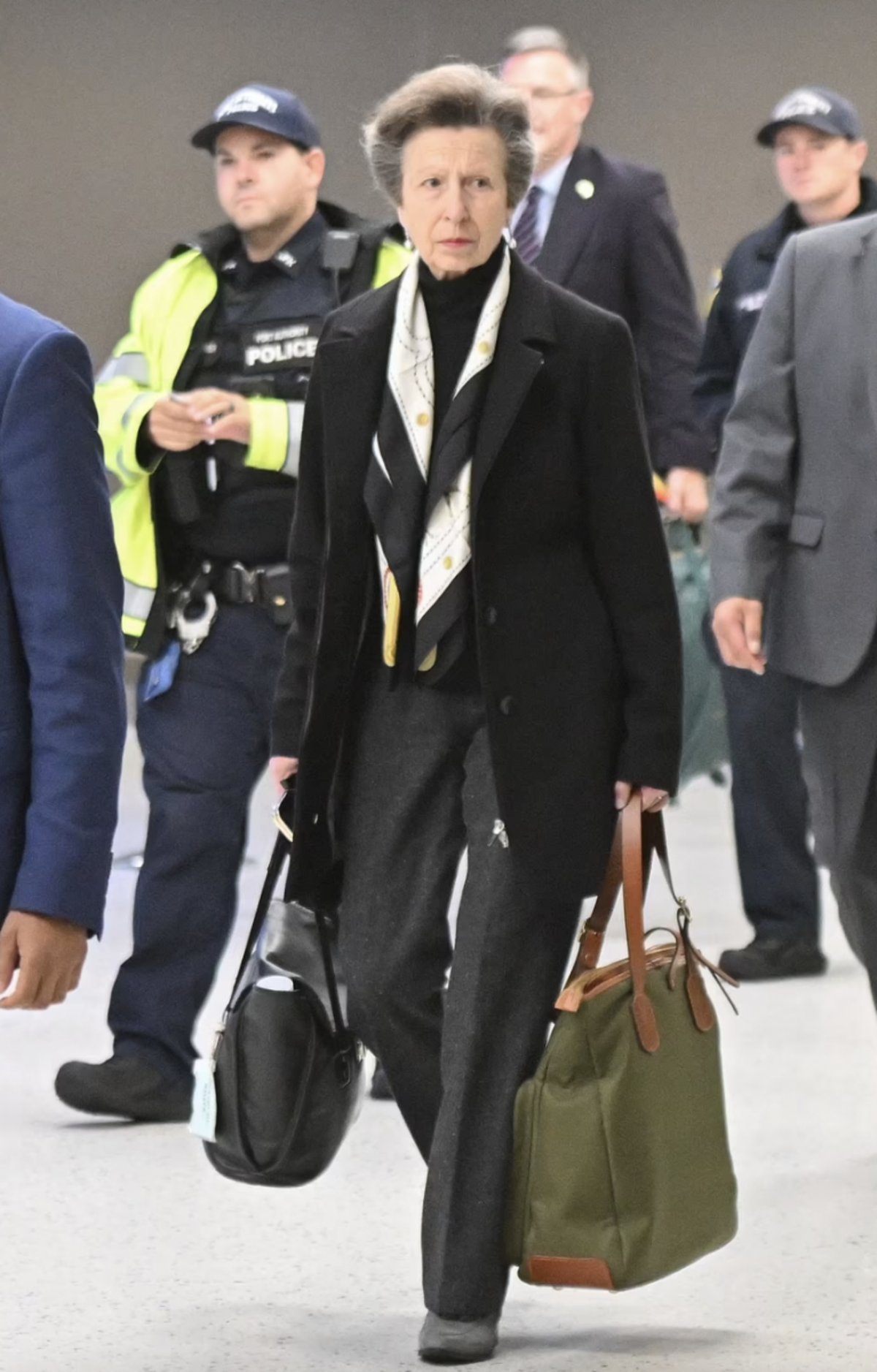 Al llegar al aeropuerto, la princesa Ana vestía un elegante traje negro, con pantalones negros y un blazer oscuro con un jersey de cuello alto, un pañuelo blanco y negro alrededor de su cuello.