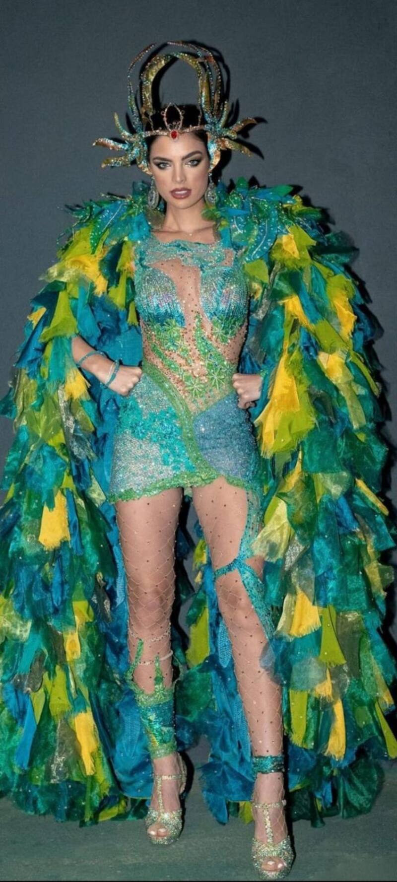 El impresionante atuendo está compuesto de plumas, más de 60 mil cristales Swarovski que le tomó a 30 personas más de 90 horas de trabajo, además de un tocado muy especial, además está hecho en distintos tonos de verde que hacen resaltar aún más las facciones que la hacen ser una de las mujeres más hermosas del mundo.