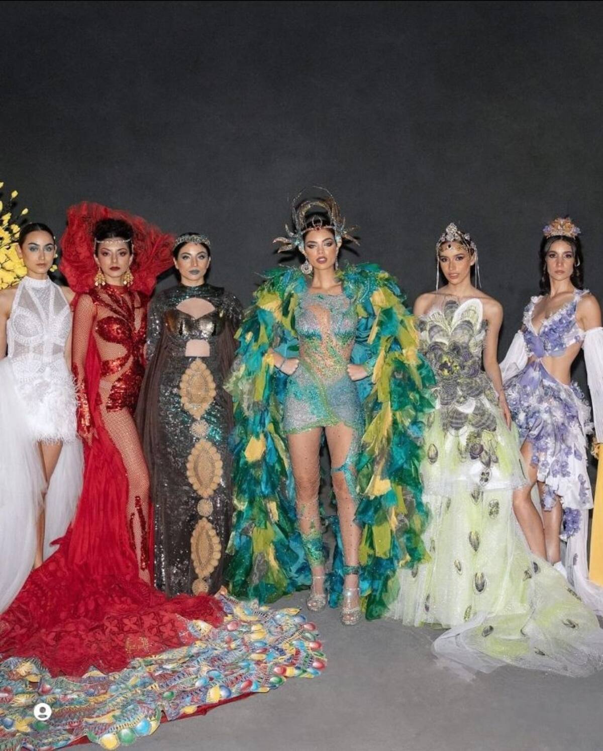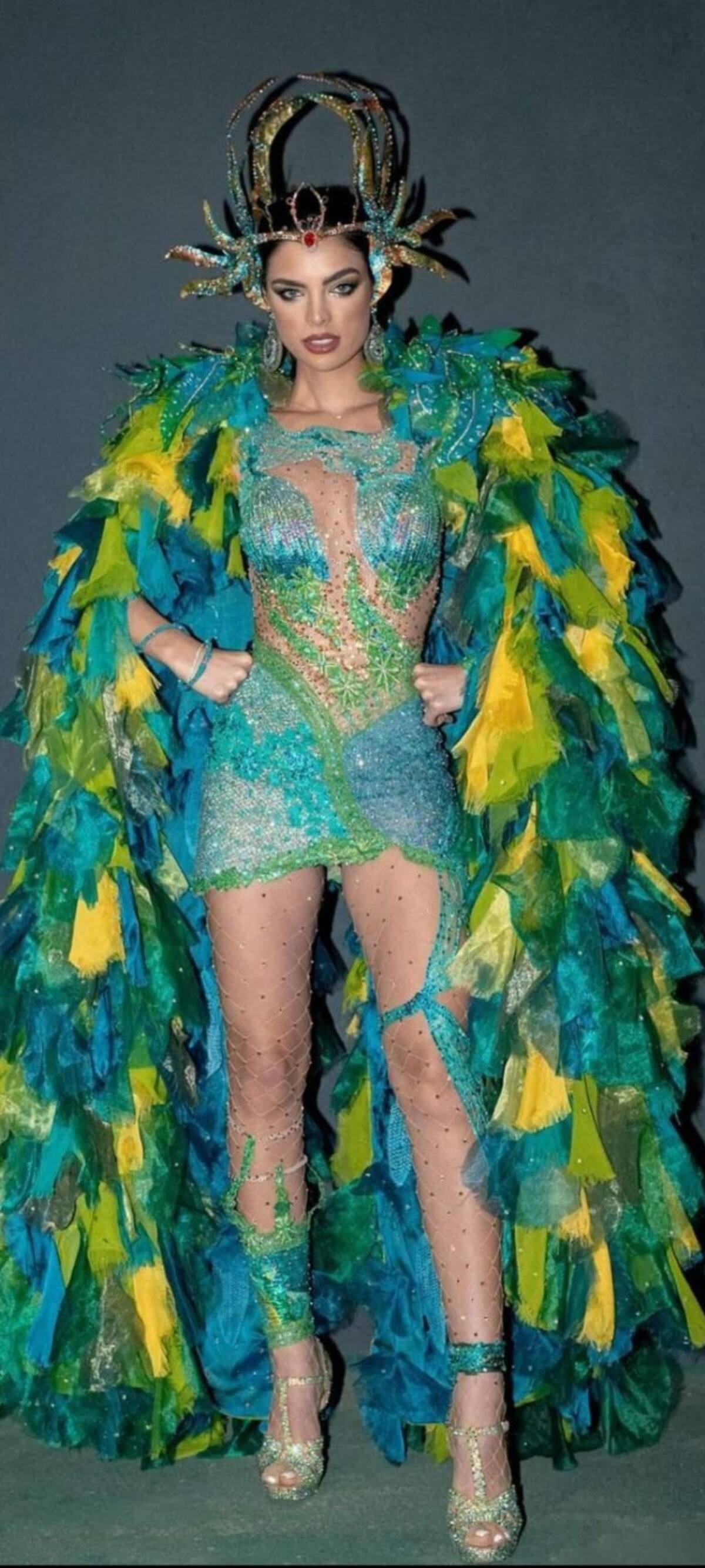 El impresionante atuendo está compuesto de plumas, más de 60 mil cristales Swarovski que le tomó a 30 personas más de 90 horas de trabajo, además de un tocado muy especial, además está hecho en distintos tonos de verde que hacen resaltar aún más las facciones que la hacen ser una de las mujeres más hermosas del mundo.