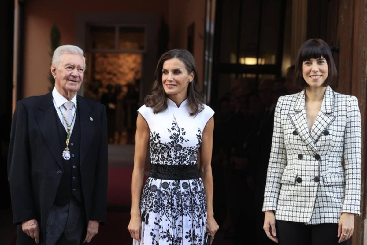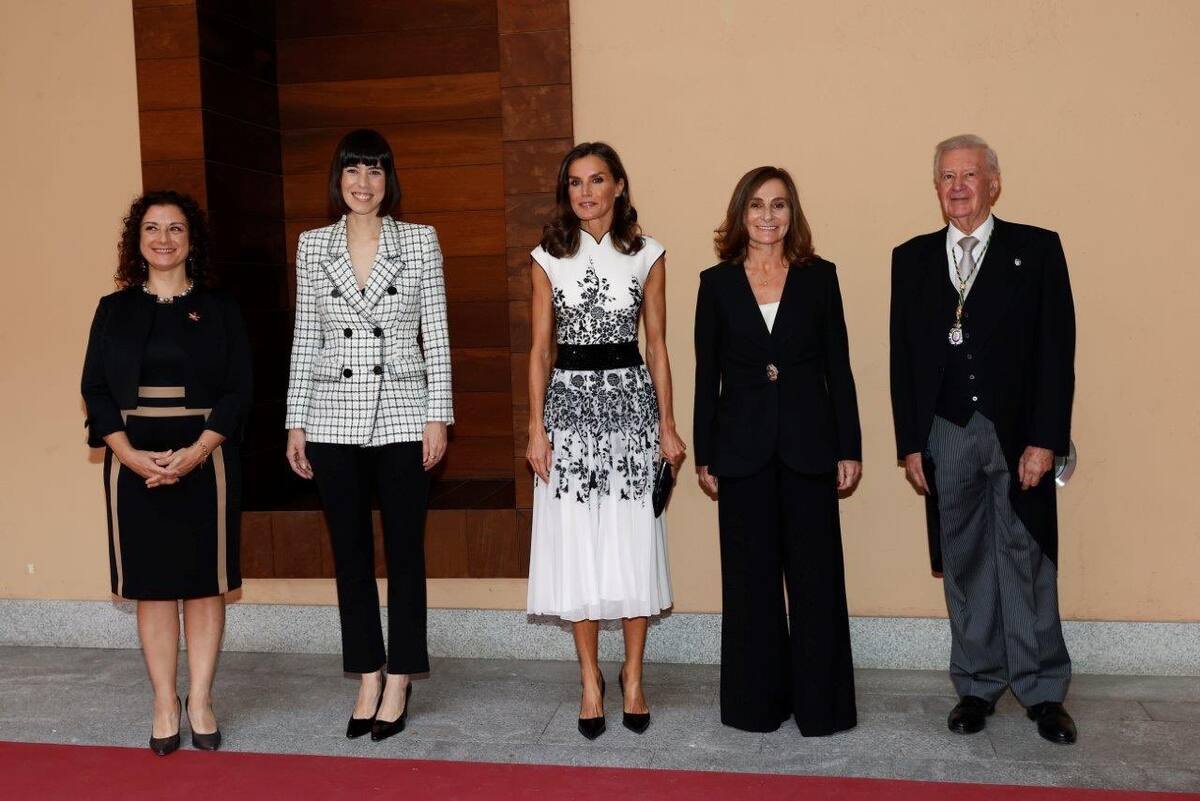 La monarca buscó en su armario el atuendo que usó en los Premios Princesa de Asturias de 2017, confeccionado por el diseñador de moda Felipe Varela. El vestido blanco con flores negras tiene una inspiración oriental y es una de las prendas más emblemáticas de las que ha usado la reina.