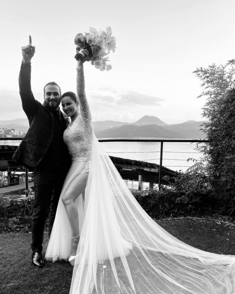 En la foto en blanco y negro ambos lucen muy sonrientes y destaca el hermoso vestido que usó Maite de mangas largas con encaje en la parte superior, falda de tul y un largo velo que combinó con zapatos de plataforma blancos de la casa de diseño Valentino, por su parte, el novio vistió completamente de negro para la elegante celebración que se realizó en Valle de Bravo.