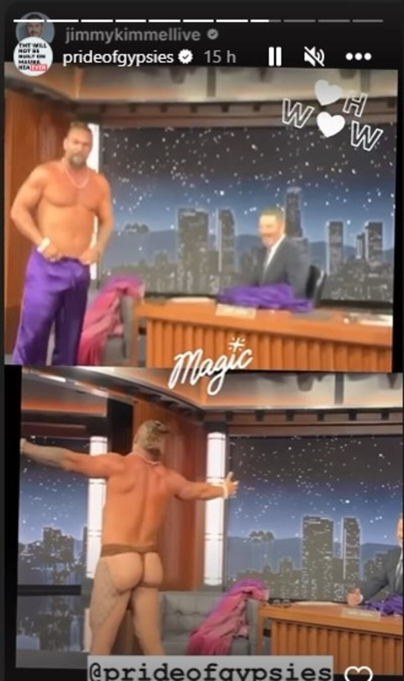 Jason llegó al programa en pijama morada, en honor a la trama de su reciente película, lo que nunca se imaginó el famoso presentador es que Jason se quitaría la ropa para evidenciar que la prenda que usó para pescar suele usarla casi de tiempo completo.