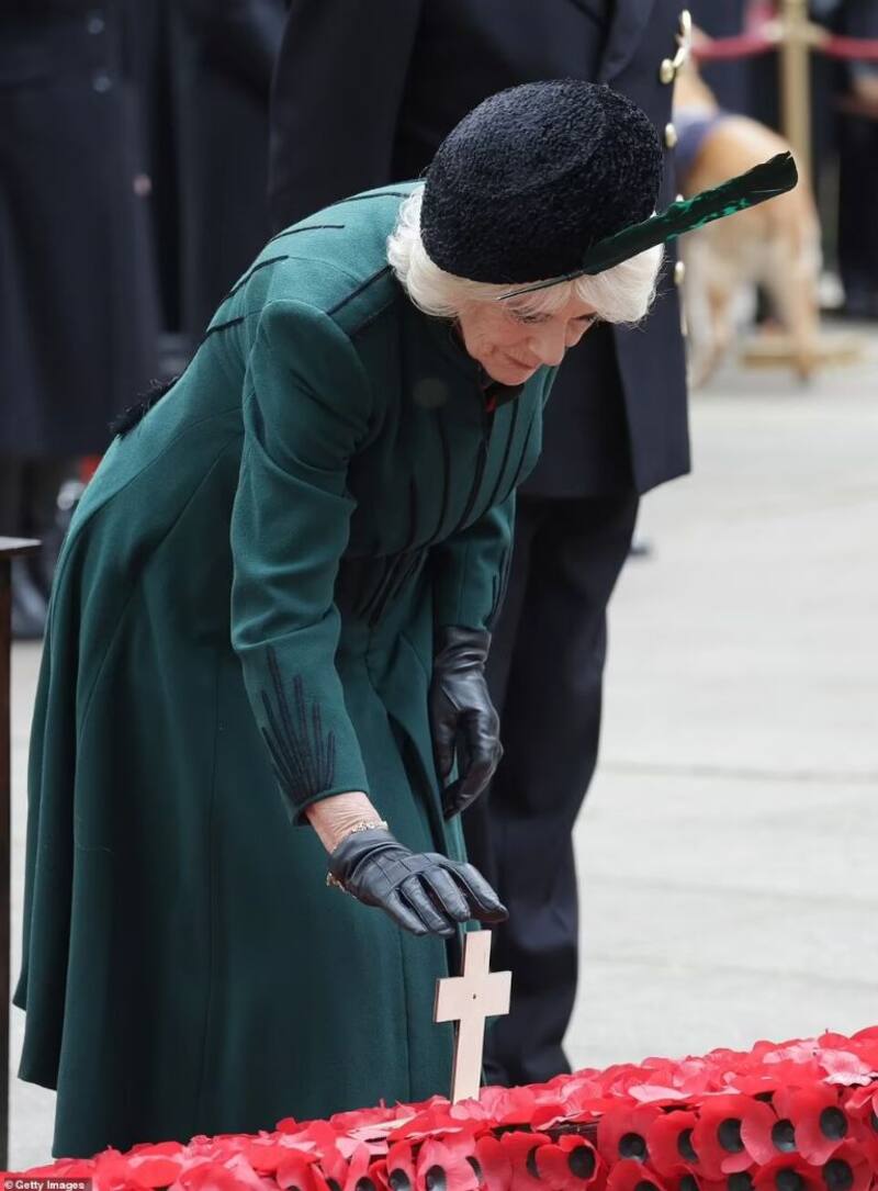 Como parte de sus funciones, la reina Camila estuvo encargada de colocar una pequeña cruz de madera en un memorial que honra a los fallecidos bajo la expectante mirada de soldados, marineros y aviadores, esta conmemoración se realiza todos los años desde 1928.