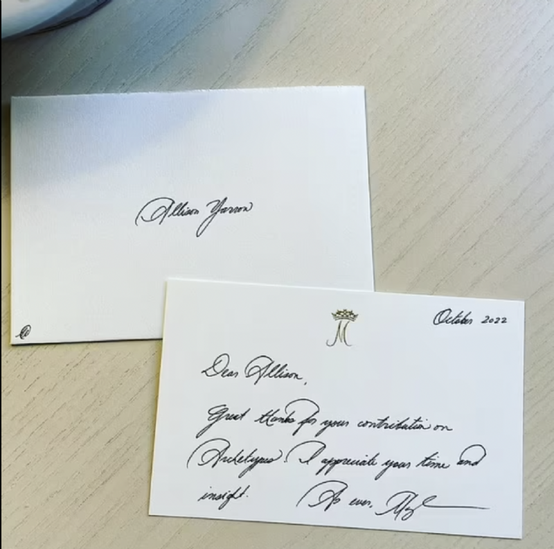 El uso de su sello real quedó expuesto luego de que la autora Allison Yarrow compartió en su cuenta de Instagram una carta que le envió la duquesa de Sussex para agradecer su participación en el podcast Archetypes. El monograma dorado con la letra M sigue siendo utilizado por Meghan a pesar de que hace tres años se alejó de la vida real.