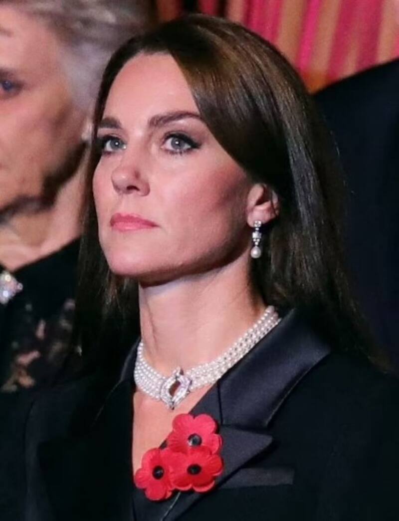 Su apariencia melancólica y sombría se apropió de una ceremonia muy contenida. Destacaron en el tono oscuro de la apariencia de Kate sus tres amapolas rojas, la única distinción de color que llevó la princesa de Gales. Las tres flores representan ,según historiadores de la realeza, al trío de parientes miembros de la realeza que murieron en la Pirmera Guerra Mundial.