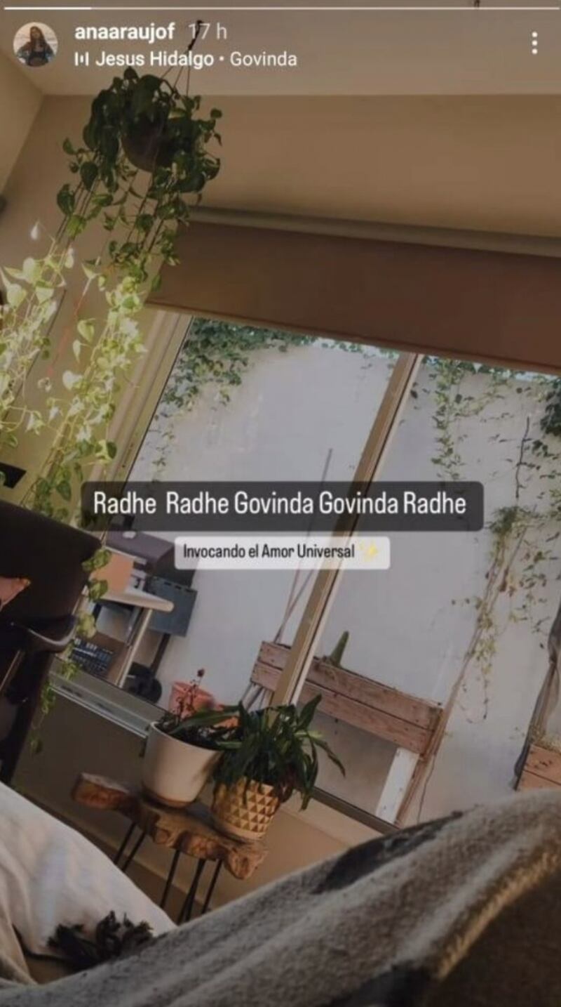 Ana Araujo publicó una foto al interior de su casa y colocó la frase "Rhade Rhade Govinda Govinda Rhade, invocando al amor universal", evidenciando su lado más espiritual en el que se ha refugiado.