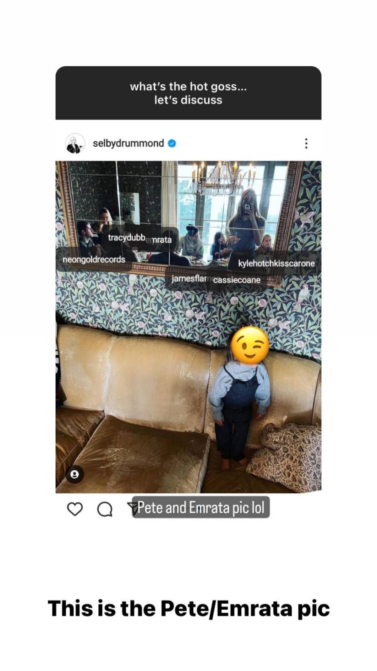 La modelo fue etiquetada en una postal que subió Selby Drummond, fundadora de la aplicación de citas Bumble y amiga de la también escritora. La foto fue retirada minutos después de ser publicada, pero la cuenta de Instagram Deux Moi, especialistas en chismes de famosos, la volvió a difundir.