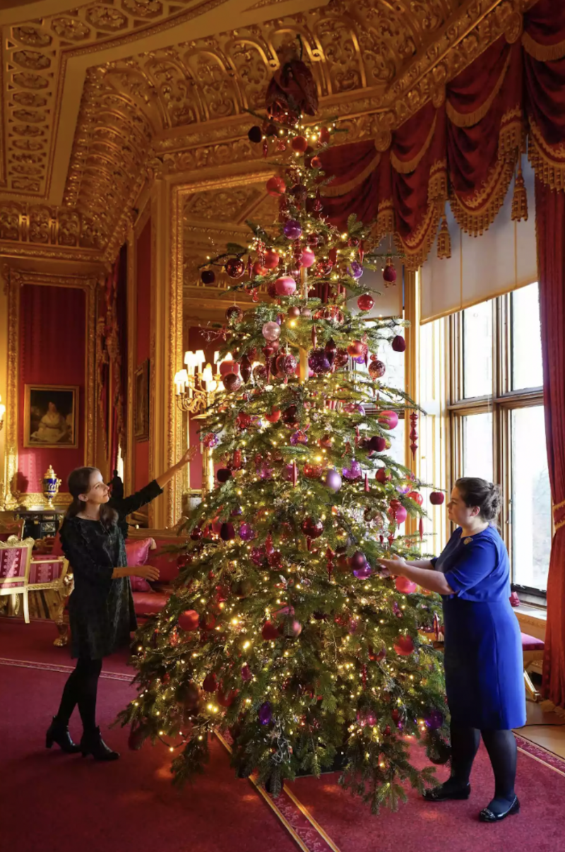 Además, para echar la casa por la ventana, en el Castillo de Windsor fueron colocados un árbol abeto de Nordmann de 6 metros de alto el cual fue cultivado de manera sostenible en las cercanías del Windsor Great Park y un árbol de hoja perenne colocado en el Crimson Drawing Room.