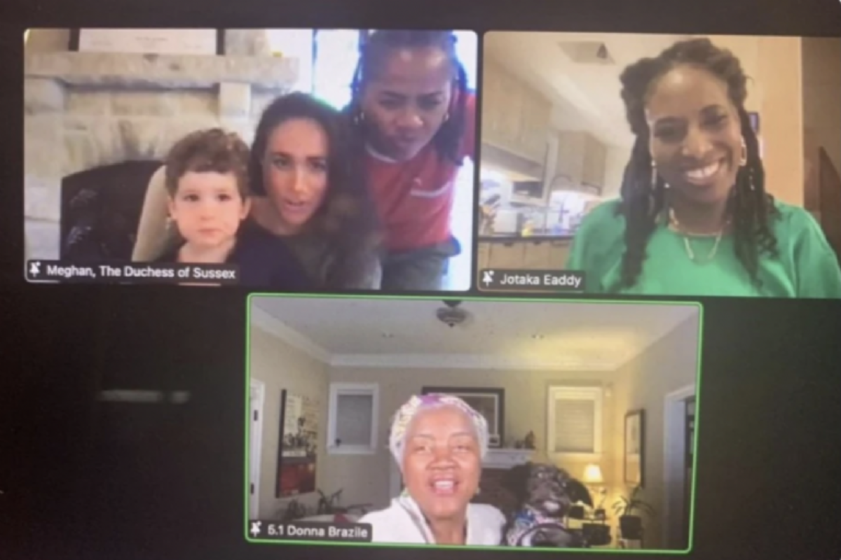 En la instantánea que ya circula por internet también se puede ver a su abuela, Doria Ragland, quien lució una blusa roja y pantalones casuales. Archie, Meghan y Doria se unieron a una videollamada con Jotaka Eaddy, directora ejecutiva de la consultora de impacto social Full Circle Strategies y la estratega política estadounidense Donna Brazile.