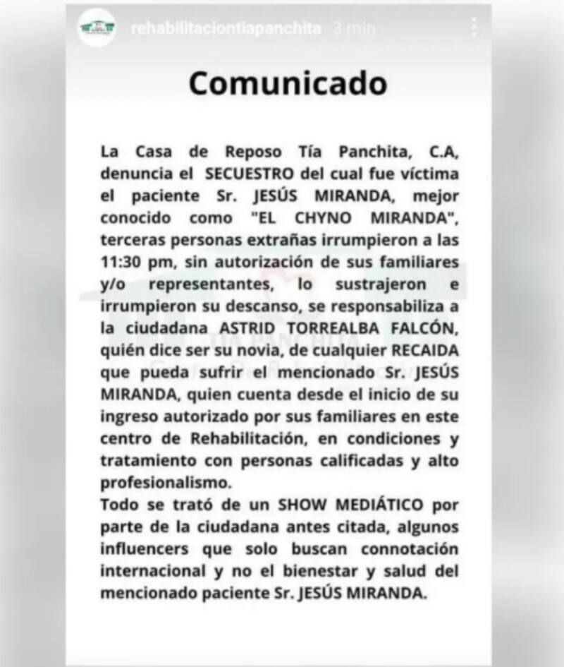 “La Casa de Reposo Tía Panchita, C.A, denuncia el secuestro del cual fue víctima el paciente Sr. Jesús Miranda, mejor conocido como ‘El Chyno Miranda'. Terceras personas extrañas irrumpieron a las 11:30 p.m. sin autorización de sus familiares y/o representantes, lo sustrajeron e irrumpieron su descanso, se responsabiliza a la ciudadana ASTRID TORREALBA FALCÓN, quien dice ser su novia, de cualquier recaída que pueda sufrir el mencionado Sr. Jesús Miranda”, señaló el centro de rehabilitación en sus historias de Instagram.