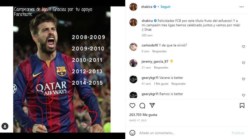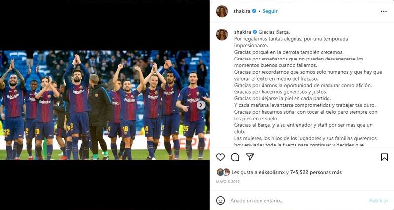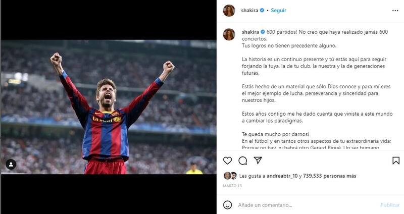 En su cuenta de Instagram, la intérprete de Te felicito y Monotonía subió varias fotografías de Piqué con su playera blaugrana y destacando los logros que consiguió a lo largo de los años, uno de los más reciente hizo referencia a los 600 partidos que jugó y fue a principio de este año.