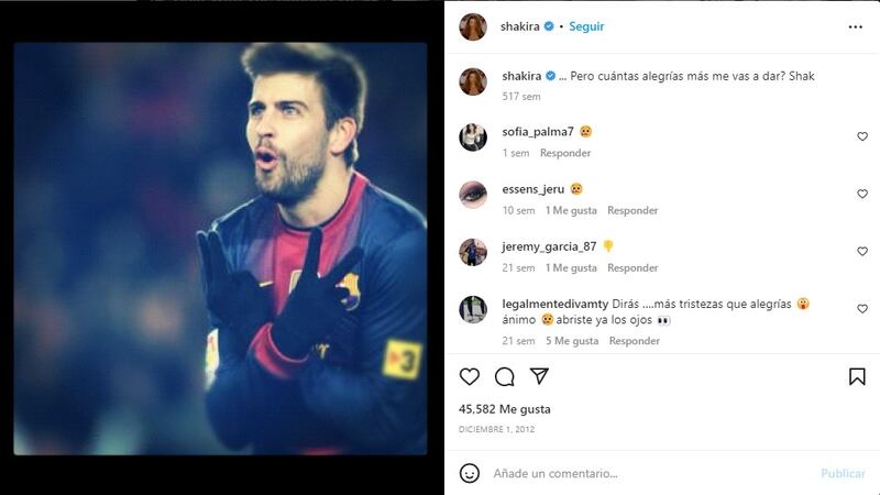 En su cuenta de Instagram, la intérprete de Te felicito y Monotonía subió varias fotografías de Piqué con su playera blaugrana y destacando los logros que consiguió a lo largo de los años, uno de los más reciente hizo referencia a los 600 partidos que jugó y fue a principio de este año.