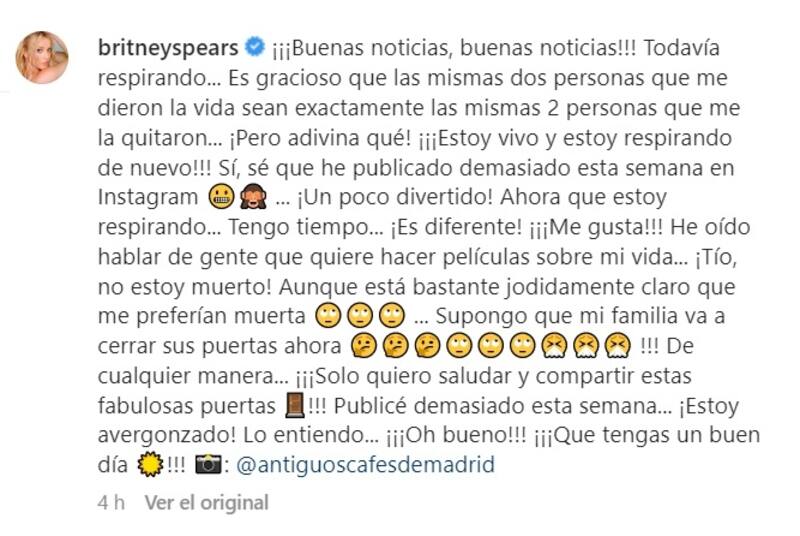 La intérprete de Oops!...I Did It Again manifestó que, desde su punto de vista, estaba "jodidamente claro que me preferirían muerta". Britney Spears cerró el mensaje deseando un "buen día" para su seguidores y acabando con la intención que la protagonista de Enola Holmes (2020) reveló para su futuro.