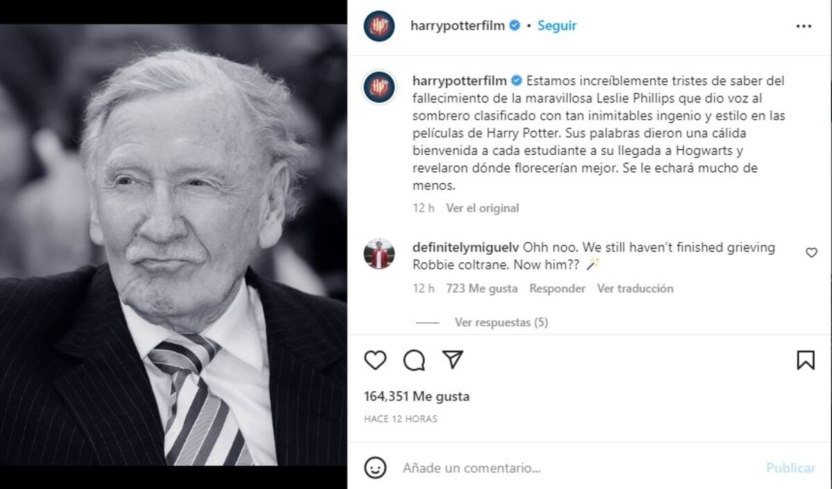 "Estamos increíblemente tristes de saber del fallecimiento de la maravillosa Leslie Phillips que dio voz al sombrero clasificado con tan inimitables ingenio y estilo en las películas de Harry Potter", fue el mensaje que dejaron los productores sobre la partida de Leslie.