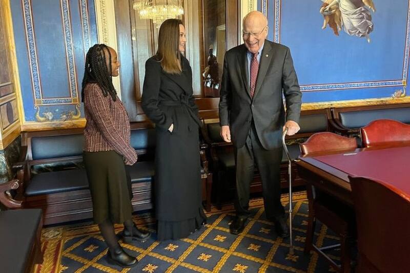 La alumna de la universidad HBCU Spelman College y su madre, llegaron al Capitolio para entrevistarse con miembros del congreso estadounidense. En la fotografía publicada por Jolie en Instagram, Zahara aparece conversando con Patrick Leahy, presidente pro tempore del Senado de Estados Unidos, para abogar por la Ley de Reautorización de Justicia para Todos de 2022.