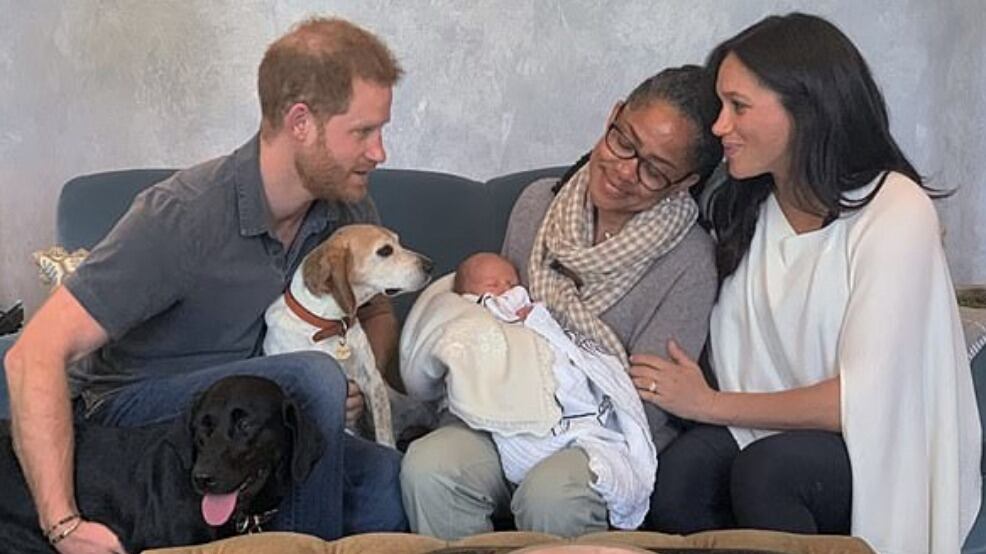 Otra de las imágenes que llama la atención es el retrato familiar de Meghan, Harry, la abuela Doria Ragland y los perros de la familia, el labrado Pula y el beagle Guy.