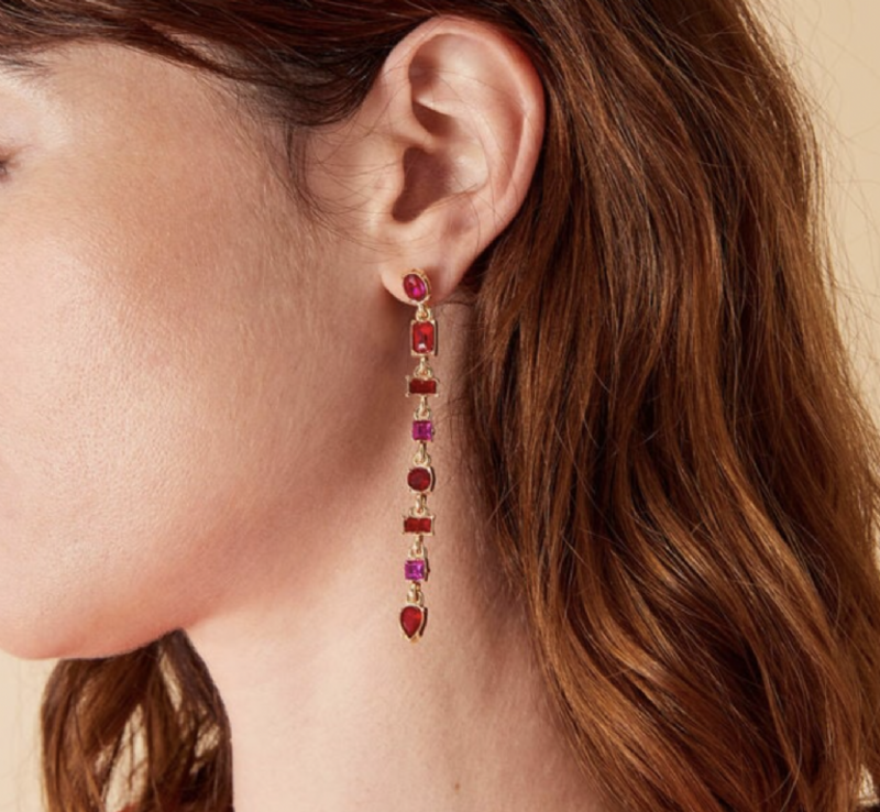 Los pendientes colgantes largos Eclectic Gem Statement se encuentran disponibles mediante la página de internet de la tienda bajó la descripción: "Presume de estos ricos y vibrantes tonos de moras con estos aretes. Están elaborados en un perfil de gota larga, con una colección de piedras eclécticas. Simplemente combínalos con rizos sueltos y mira cómo se asoman los destellos mientras se mezclan en la fiesta".