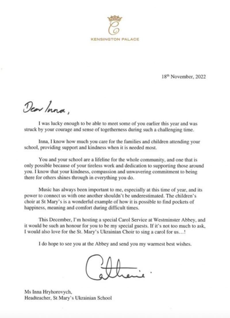Uno de los momentos más emotivos del evento es cuando Inna Hryhorovych, directora de la escuela ucraniana St Mary's de Londres, recibe una carta de Kate en la que le agradece la atención que presta a los niños que asisten a la escuela en medio del conflicto en su país.