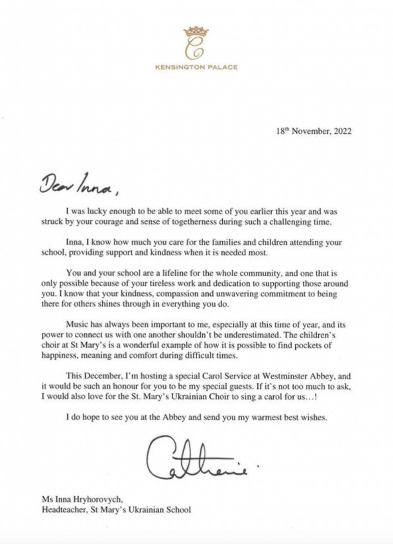 Uno de los momentos más emotivos del evento es cuando Inna Hryhorovych, directora de la escuela ucraniana St Mary's de Londres, recibe una carta de Kate en la que le agradece la atención que presta a los niños que asisten a la escuela en medio del conflicto en su país.