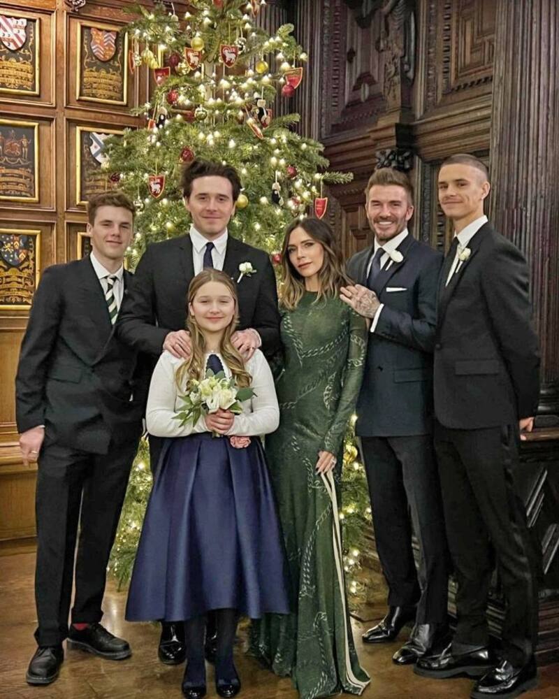 La imagen data de la fiesta de Navidad de 2021 y en ella aparecen con impecables atuendos el padre de familia, Victoria Beckham (48) y sus hijos Brooklyn, Romeo, Cruz y Harper. David, parado al lado de su hijo Romeo, decidió cargar el peso de su cuerpo en los dedos del pie para separar los talones del suelo y ganar un poco de altura. Los usuarios de redes sociales reaccionaron inmediatamente en tono de burla.