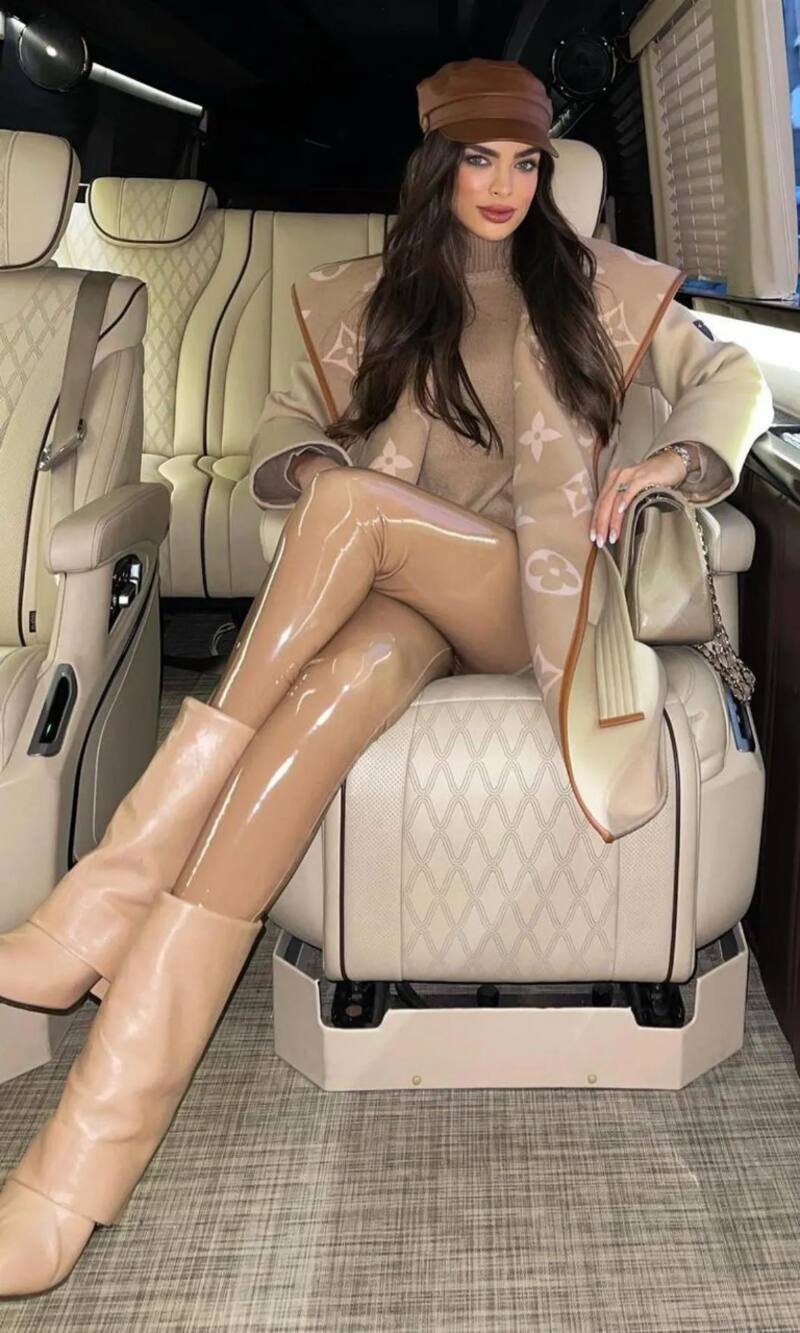 En una de sus publicaciones de Instagram, Nadia causó furor al lucir un look bastante llamativo cuando aterrizaba en Nueva York. El atuendo consistía en unos leggins de charol en tono nude y un abrigo con cuello oversized de Louis Vuitton en color beige. Además de un par de botas Givenchy a juego y una boina café junto con un bolso de diseñador para completar su look.