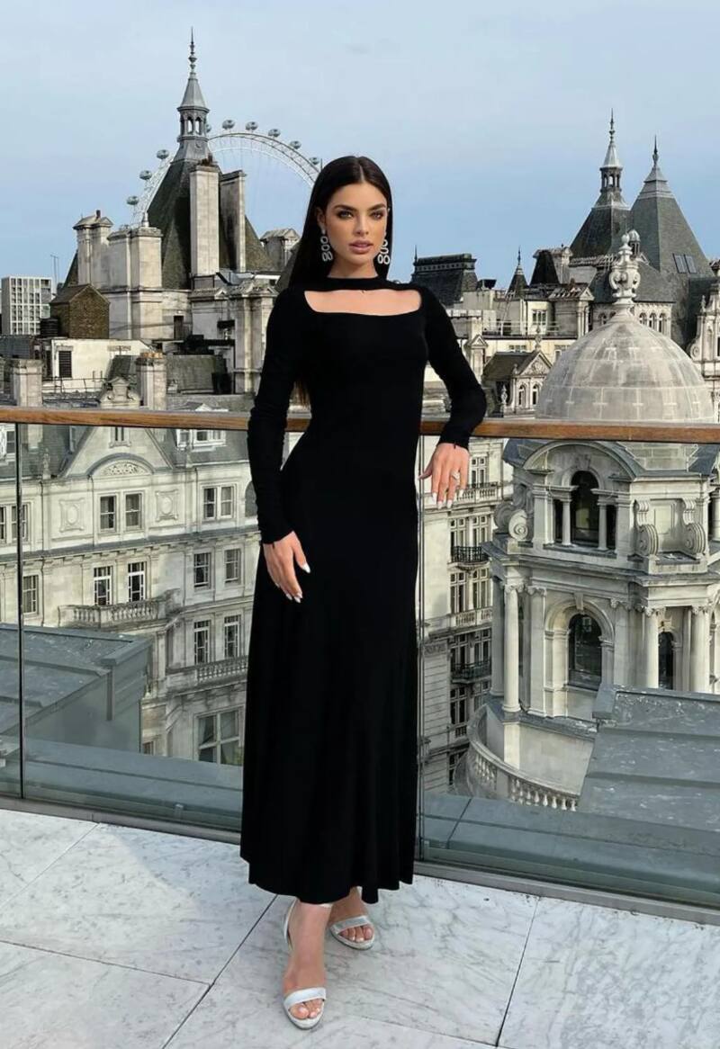 Para acompañar a su novio en la gira musical por Europa, la modelo volvió a repetir un diseño de Victoria Beckham, en esa ocasión era un vestido en color negro con manga larga, el cual completó con unas sandalias en color blanco.