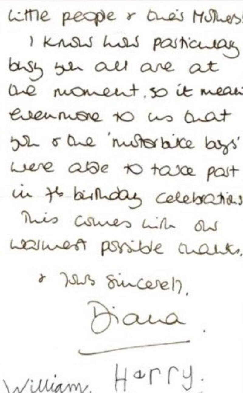 "Estimado sargento Plumb, fue muy amable de su parte y de su equipo haber venido aquí hoy en el cumpleaños de William. ¡No puedo comenzar a decirles el placer que les dio la exhibición a todas esas personitas y sus madres! Sé lo particularmente ocupados que están, ¡así que significó aún más para nosotros que ustedes y los motociclistas pudieran participar en las celebraciones de cumpleaños!", dice la misiva que va firmada por Diana, William y Harry".