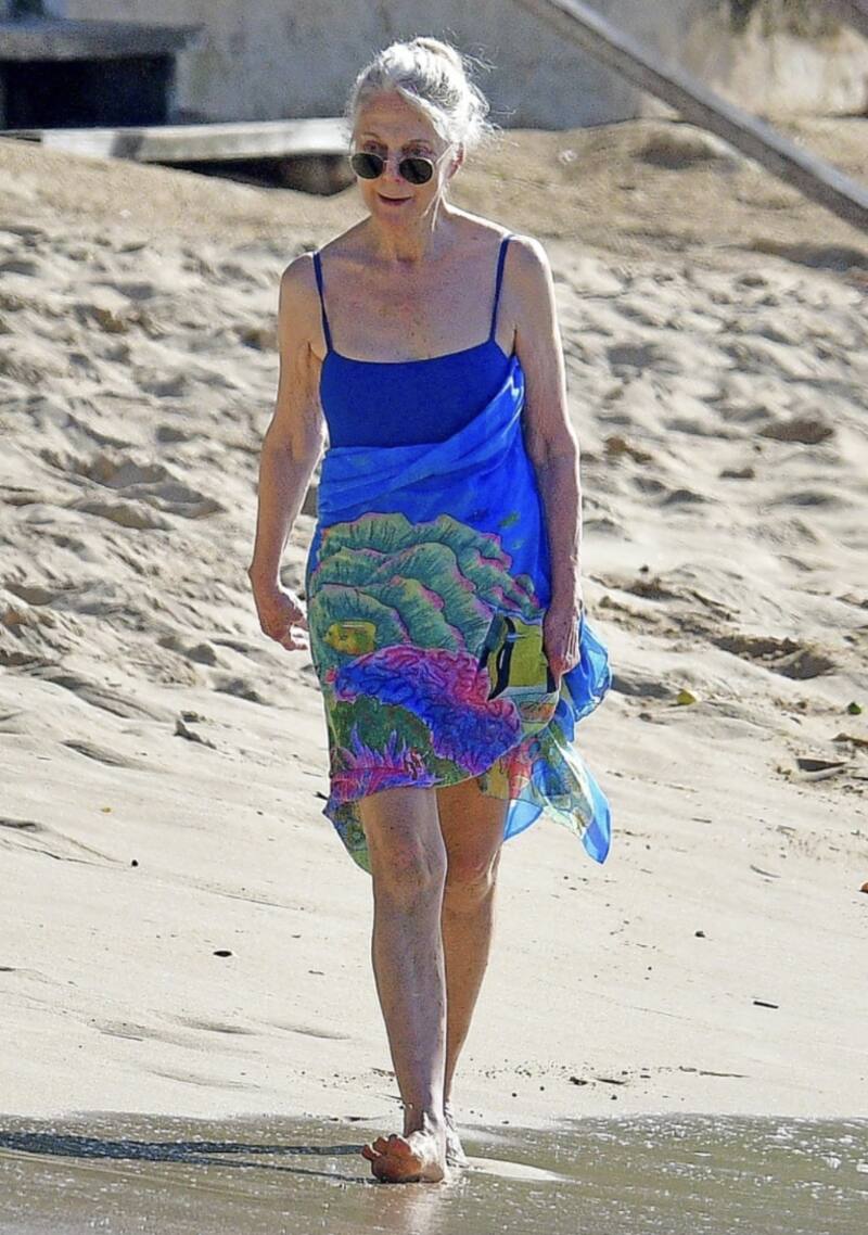 Por su parte, su mamá Blythe Danner, de 79 años portó un traje de baño de una pieza azul real y un pareo con estampado de arrecifes de coral. Completó su look con lentes de sol.