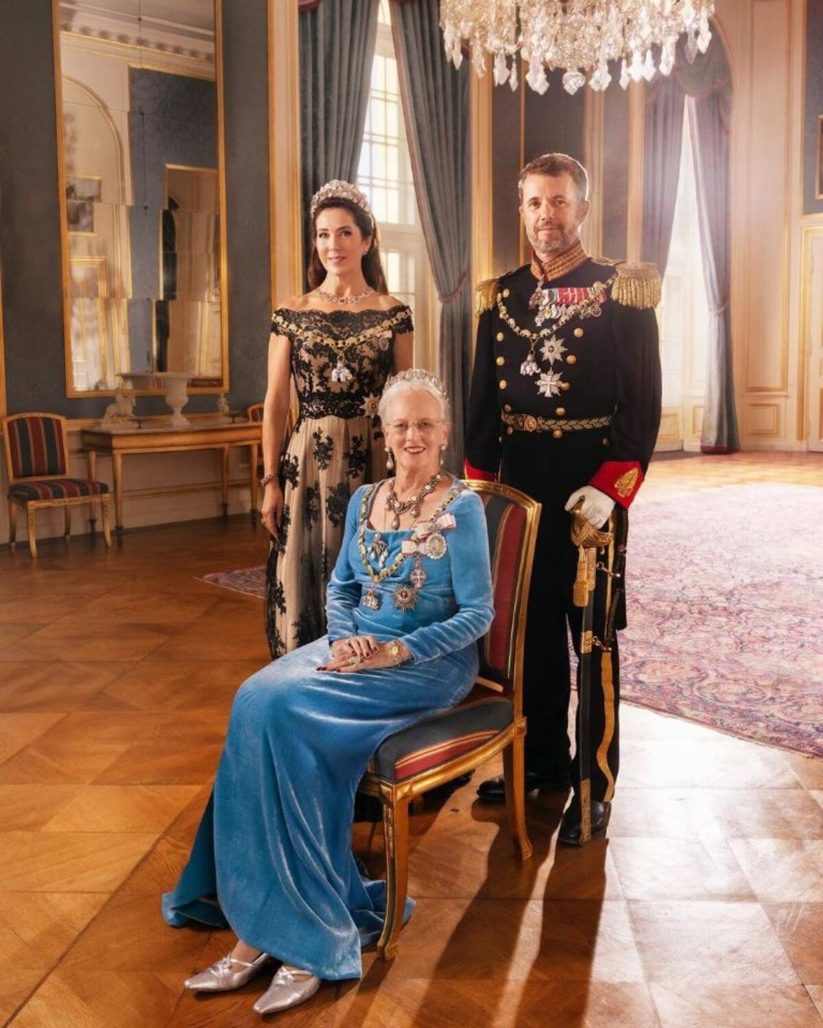 Ambas imágenes fueron tomadas. La ubicación es especial ya que este salón conduce al balcón donde la Familia Real recibe al público. La reina Margrethe aparece con el mismo atuendo de un conjunto anterior de imágenes publicadas para su Jubileo de Oro a fines de 2021.