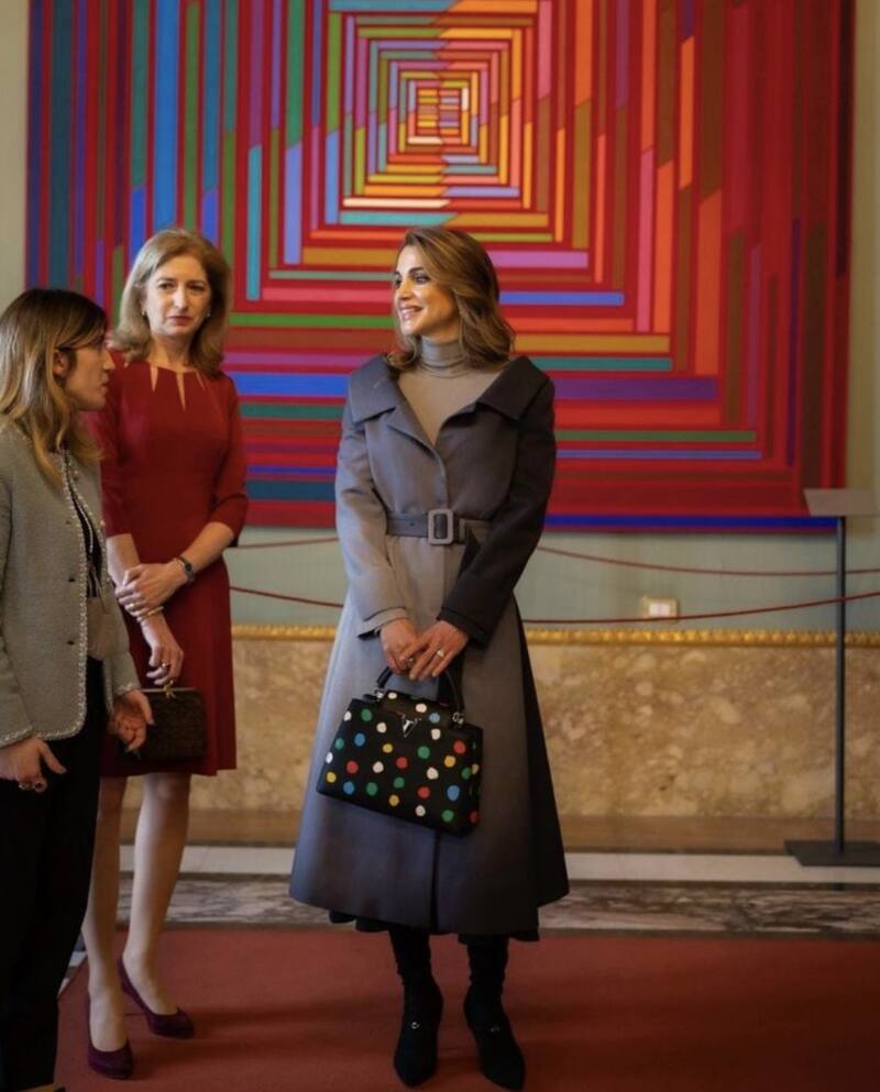 Este lunes la esposa del rey Abdalá II apareció con un abrigo estilo vestido en tonos degradados de gris, además se alcanzaba a distinguir una  falda en color negro y una blusa de cuello alto en color café y botas negras. Como toque divertido, la reina usó una bolsa negra con puntos de colores que en conjunto le dieron porte en un look que fue muy aplaudido internacionalmente.